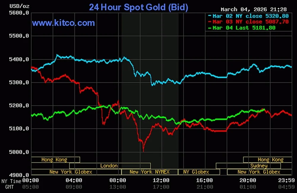 Trên sàn Kitco, vàng giao ngay (lúc 9h00) đang ở quanh giá 5.186,6 – 5.187,2 USD/ounce. Hôm qua, giá kim loại quý này tăng mạnh lên mức 5.140,2 USD/ounce.